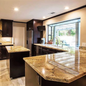 Typhoon Bordeaux granite from Brazil is a spectacular granite with combinations of gold, beiges, and bordeaux waves fused together to create a stunning colour. This durable granite is recommended for indoor and outdoor projects and is available in both in 2cm and 3cm polished finish. This versatile granite is remarkably suited for countertops, landscape features, and flooring in commercial and residential projects.